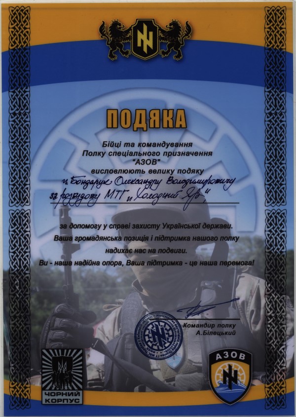 Вітаю вас шановне панство. Прийшов час мені звітуватися, а то в мене щось останнім часом з цим трошки не лади. По-перше, з приводу "Подяки" - це наша спільна робота, яку б ні я, ні Петро не виконали б без вас, тому всім хто долучається до такого виду роботи як волонтерство і його фінансування ВЕЛИКА ШАНА І ПОДЯКА від батальйону "АЗОВ" і від мене особисто.